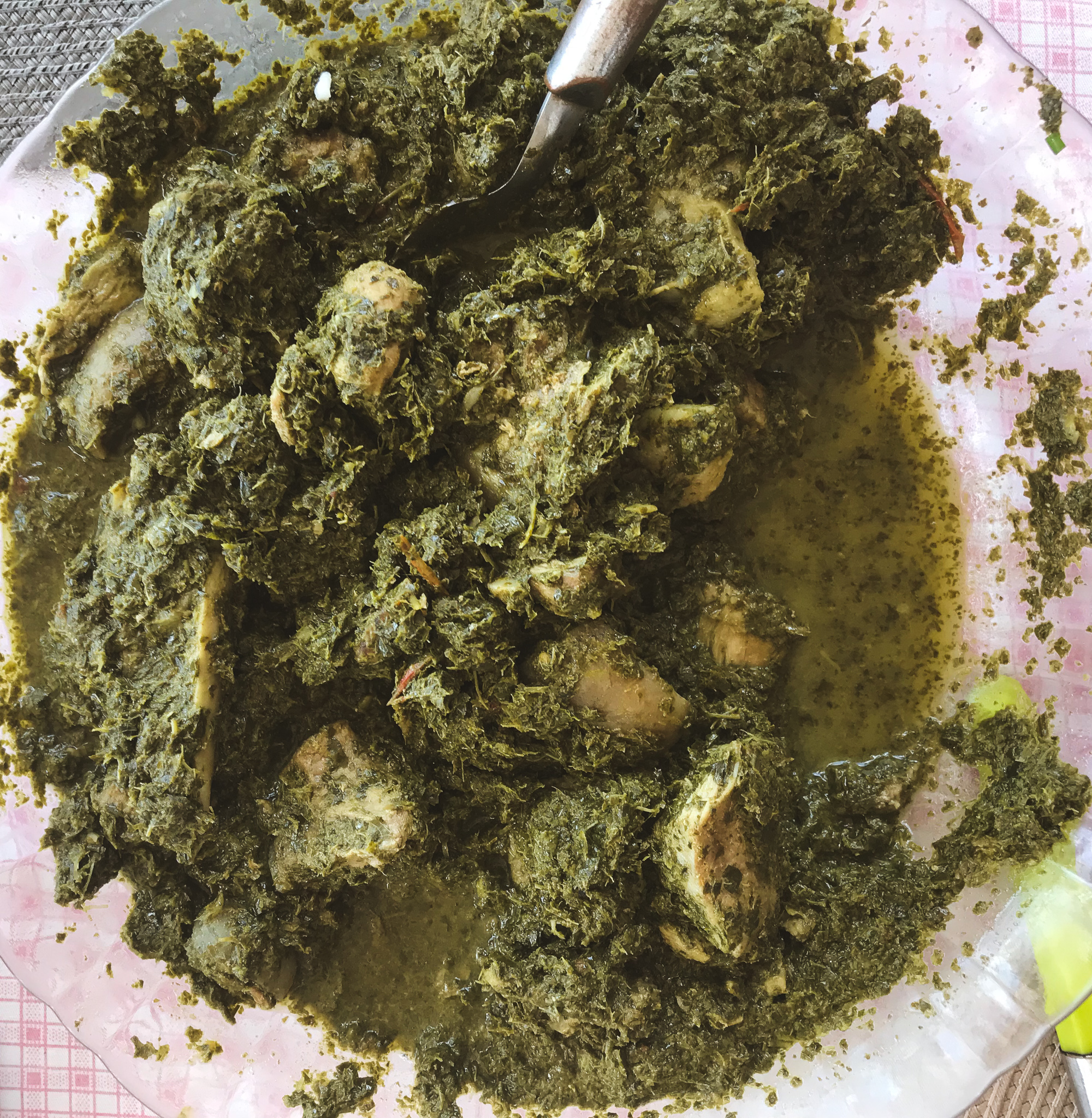 - Une fois que votre viande a commencé à dorer, vous rajouterez vos feuilles de manioc pillées, les 30 ml de lait de coco, 1 verre d’eau, le poivre et le sel