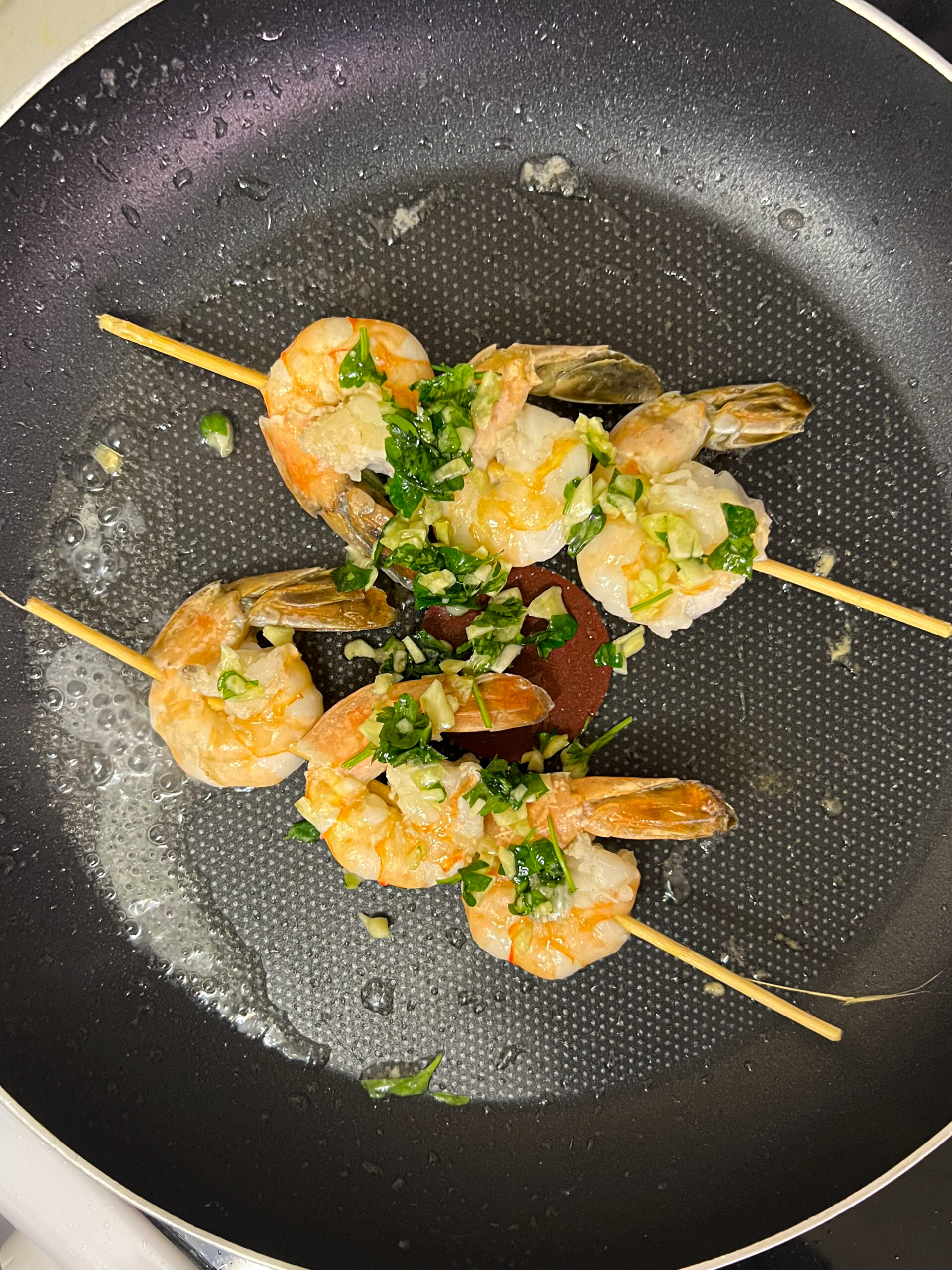 Brochettes de crevettes à l’ail, persil et huile de coco – Vue rapprochée