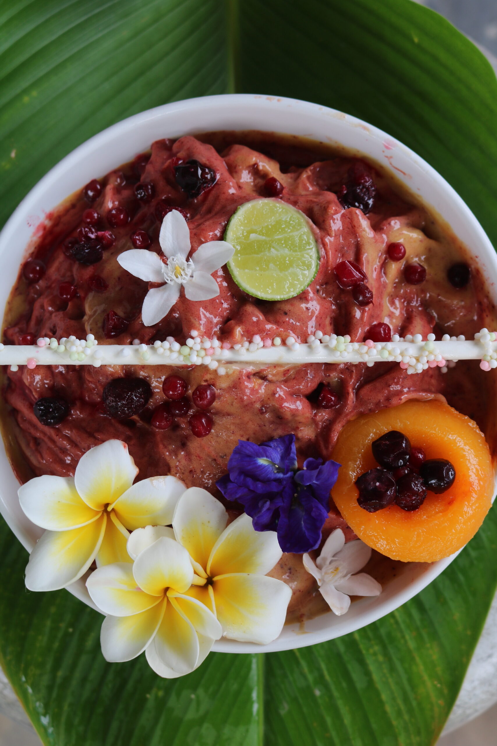 Fraises – Fruit du dragon – Banane – Ananas – Citron vert – Lait d’amande