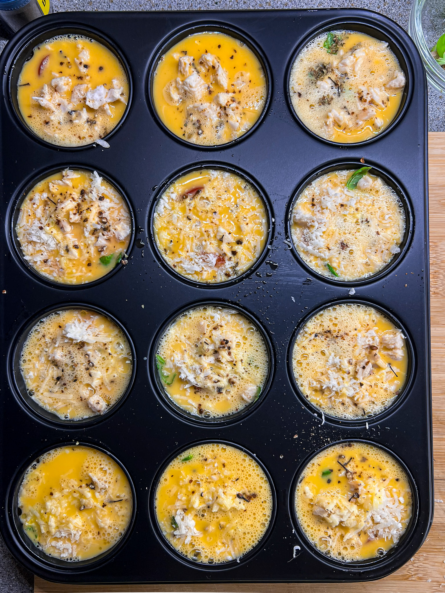 - Versez cette préparation dans le moule à muffin, sur les légumes et le poulet.