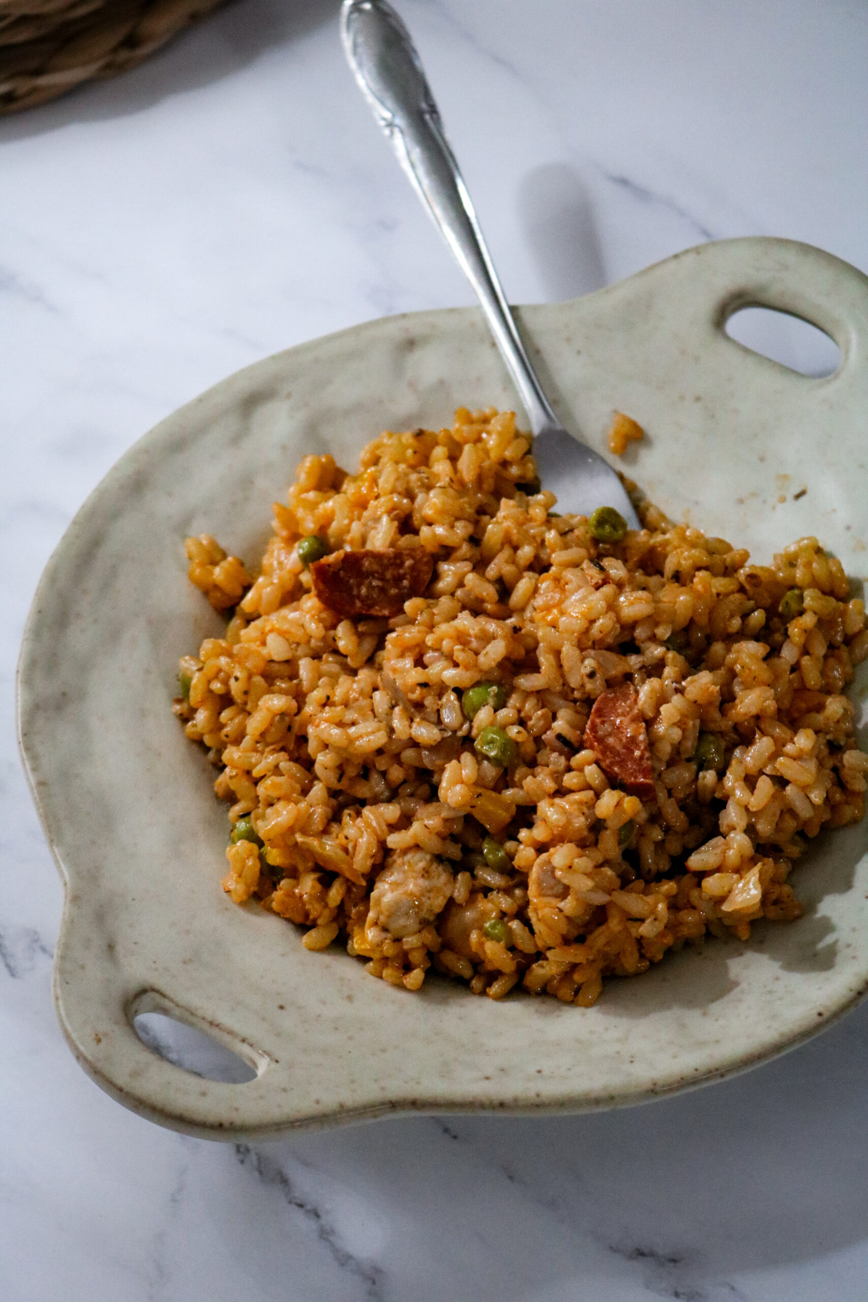 Assiette sur une table avec un risotto au poulet, chorizo et poivron