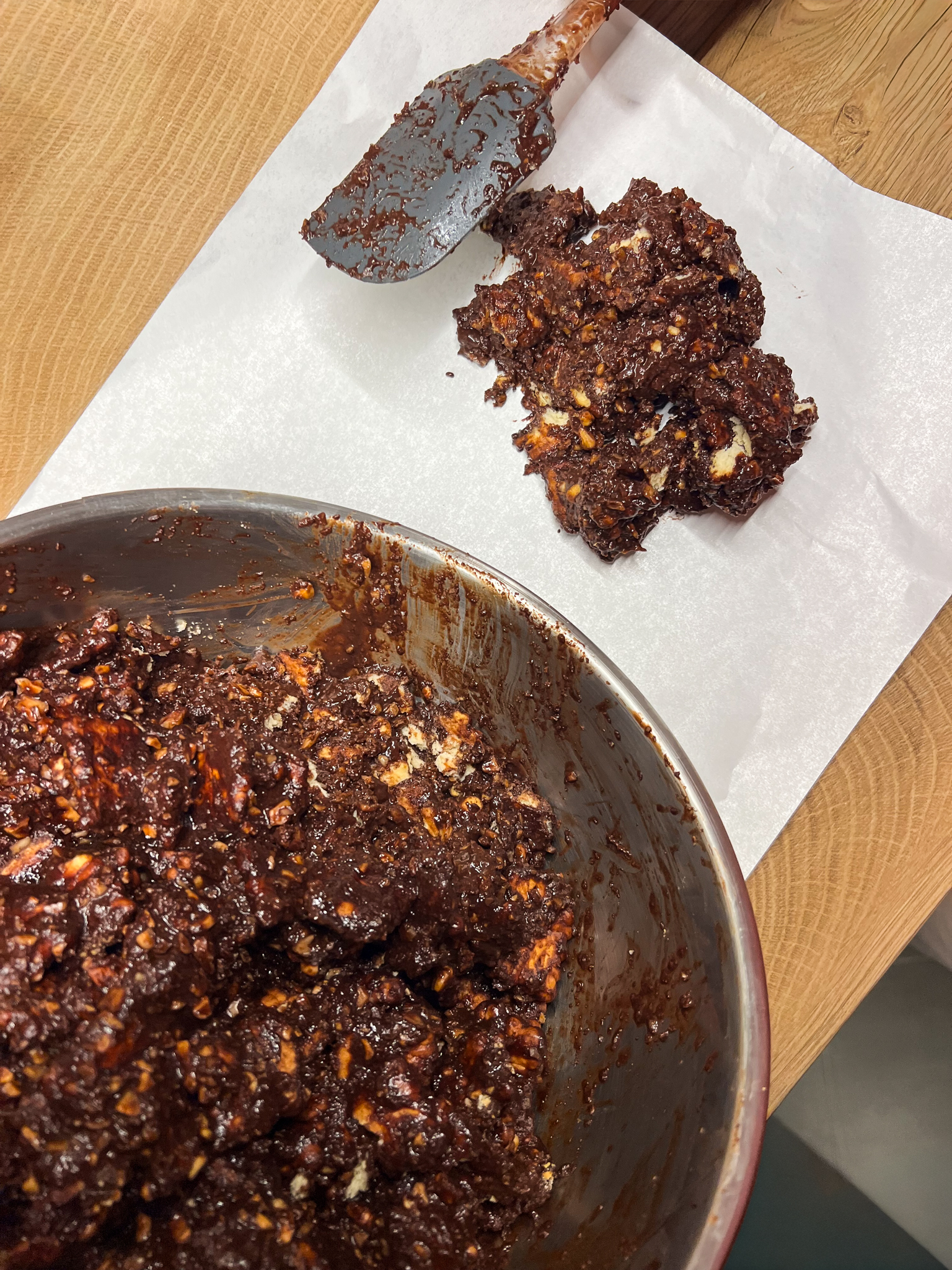 Ici, je reste très fidèle à l’esprit traditionnel, il est préparé à froid, sans cuisson, contient des noix, du rhum et est ultra-chocolaté. On n’est pas sur une version pâtissière française trop lissée ou sur une cuisson au four qui n’est pas du tout dans l’esprit traditionnel du gâteau.