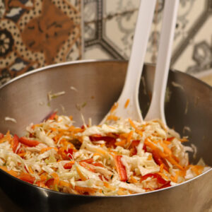 - Dans un grand saladier, mélangez le chou, les carottes, le poivron et le céleri. Pressez une gousse d’ail au-dessus des légumes à l’aide d’un presse-ail, pour une saveur intense. Ajoutez une pincée de sel marin pour réhausser toutes les saveurs. Mélangez bien pour répartir l’ail et le sel.