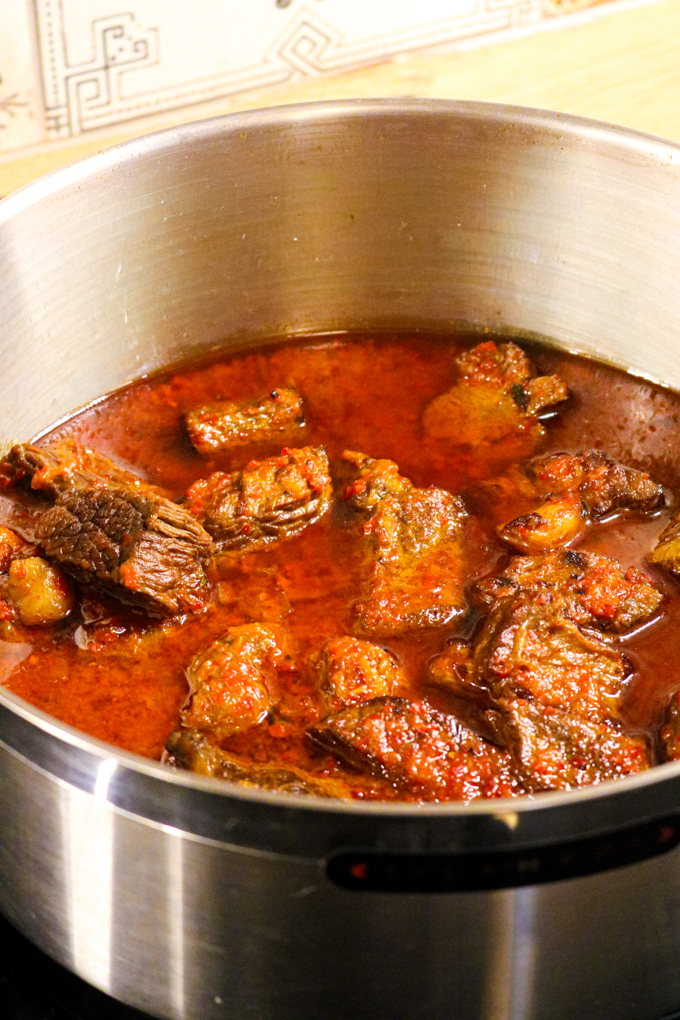 - Montez le feu 2–3 minutes pour relancer l'ébullition, ajoutez une feuille de laurier, puis couvrez, baissez à feu doux et laissez mijoter minimum 1h30 à 2h suivant la taille de vos morceaux. Remuez de temps en temps et ajoutez un peu d'eau chaude ou de bouillon léger si nécessaire.