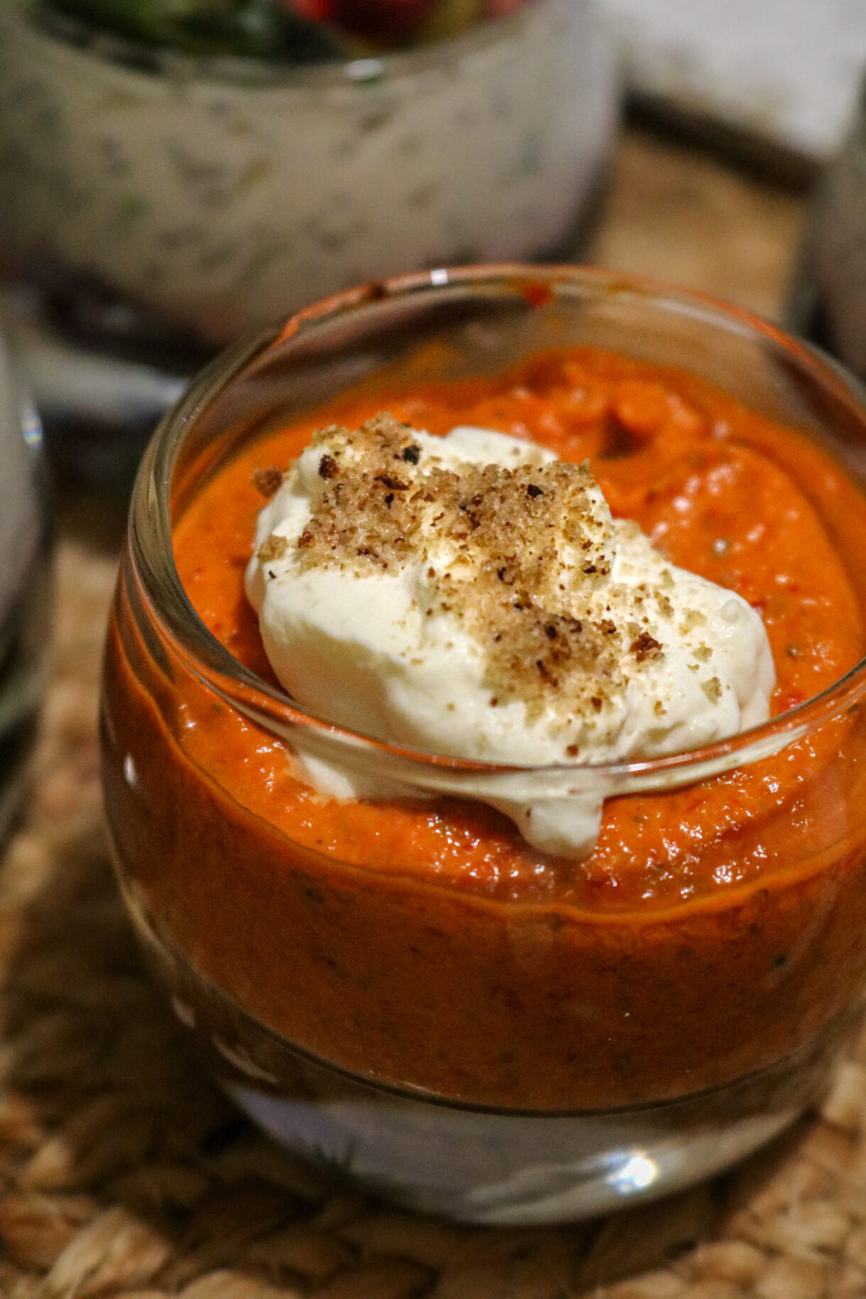 Verrine d’apéritif remplie d’un dip de poivron maison onctueux.