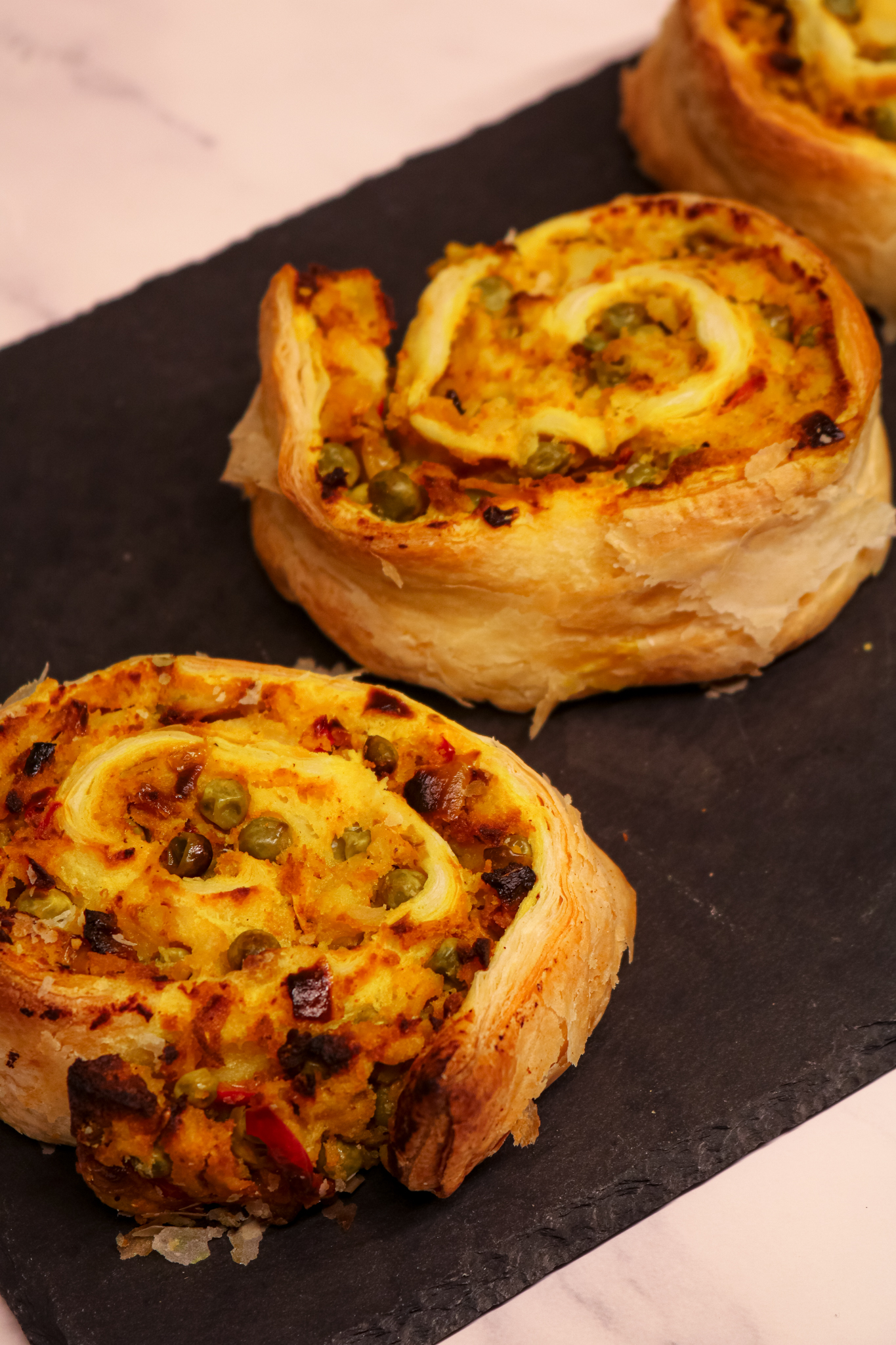 Let’s go donc dans cette revisite en version feuilleté roulé, mais où le goût intérieur épicé de la farce reste celui du samosa traditionnel. La farce végétarienne reste donc parfumée à l’indienne et se compose de purée de pommes de terre, petits pois, cumin, gingembre, ail et un subtil mélange d’autres épices.