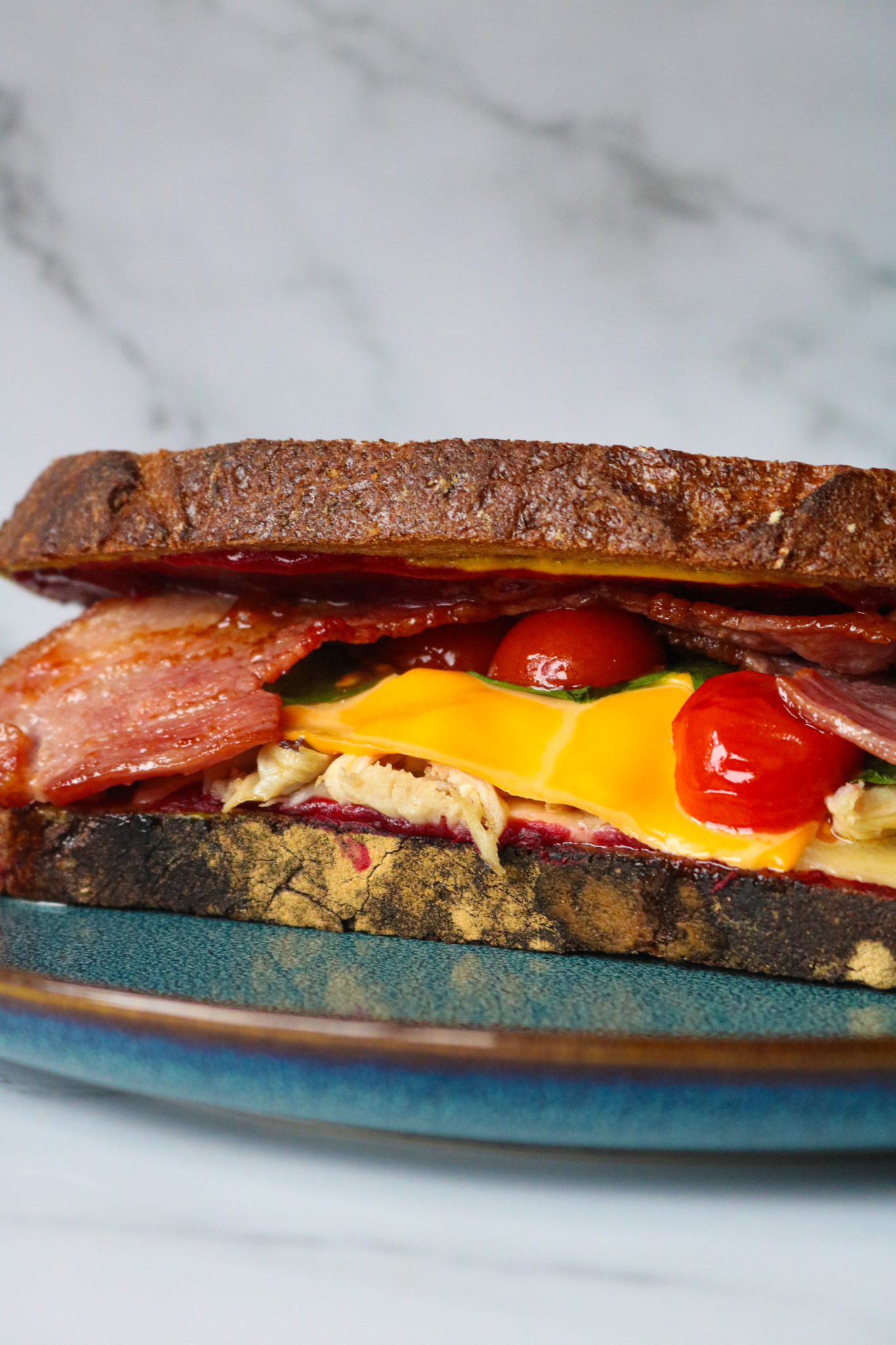 Je vous laisse donc découvrir un sandwich coloré et généreux à la dinde, au bacon croustillant, cheddar fondant, moutarde, sauce cranberry maison. Les épinards frais et les tomates cerises rôties apportent une touche de fraîcheur et de couleur.