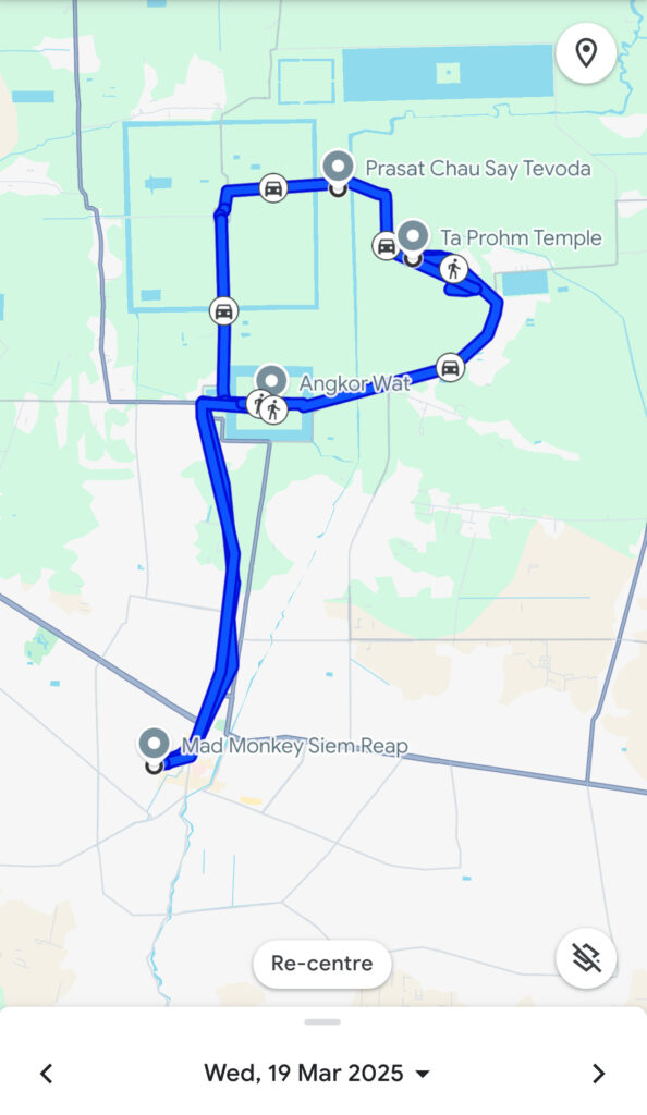 La cité est immense. Les distances peuvent être vraiment éloignées entre les temples, et le sont dans la plupart des cas. Pour profiter pleinement de la découverte des temples, je vous recommande de réserver un tuk-tuk en avance, vous convenez avec lui d’un horaire de départ et de retour approximatif (en précisant que ça dépendra de comment vous vous sentez), du prix, et vous n’aurez pas à vous en faire. Le jour du départ, il vous attendra en bas de chez vous. Les chauffeurs peuvent aussi être de vrais guides, et vous feront passer par des endroits que vous n’auriez pas découverts sans eux. Aussi, le fait d’être dans le tuk-tuk vous permettra de vous reposer un peu entre deux visites, et de vous protéger du soleil.