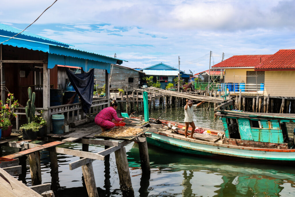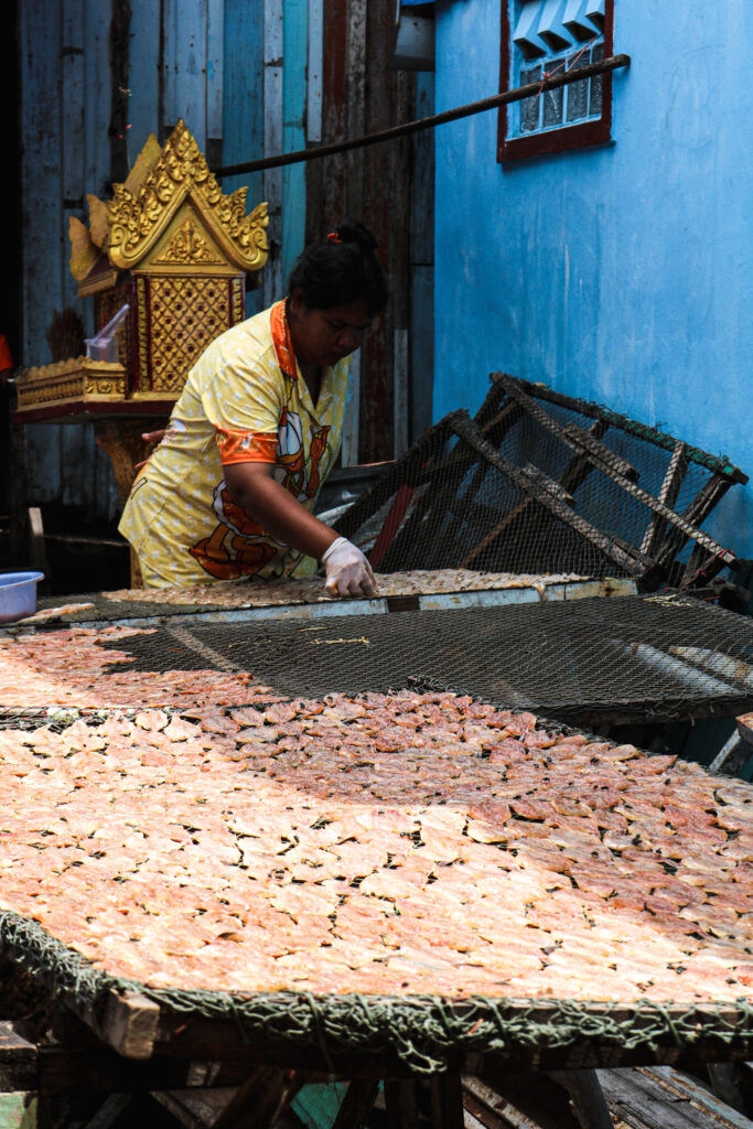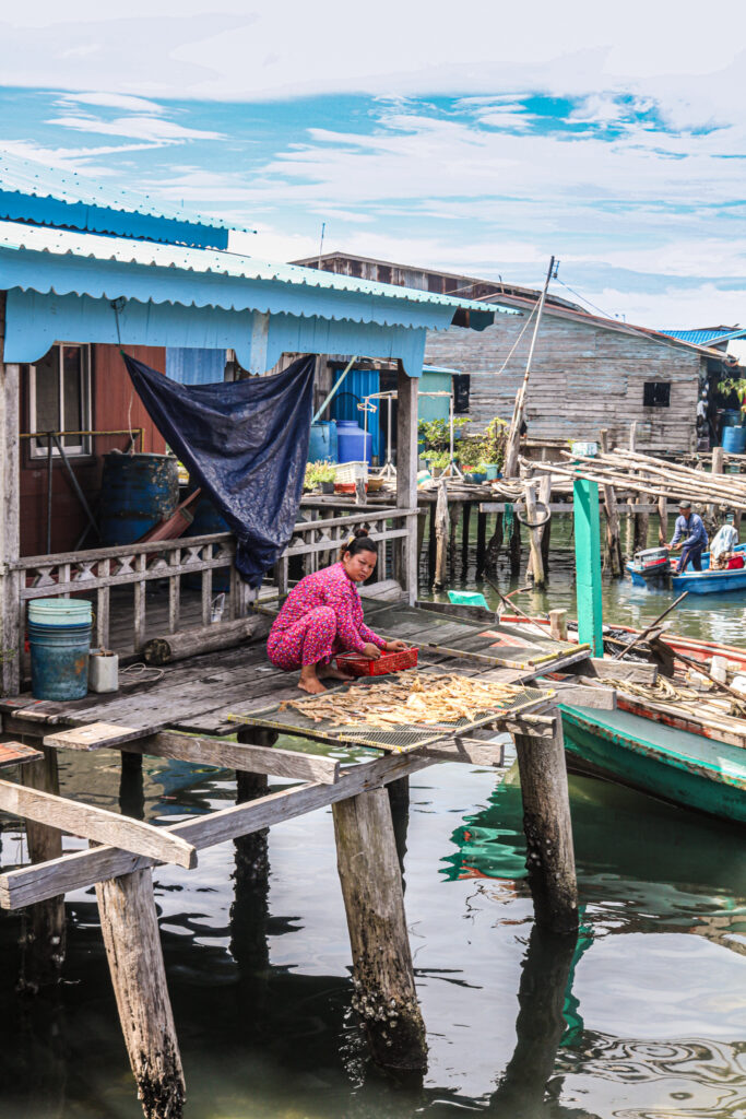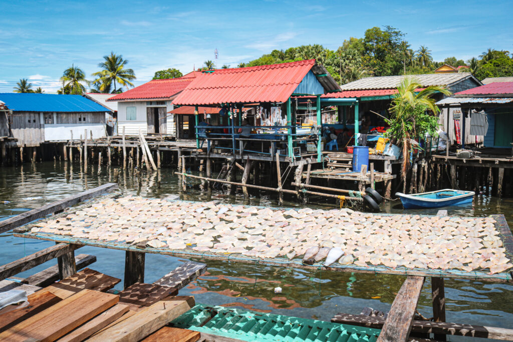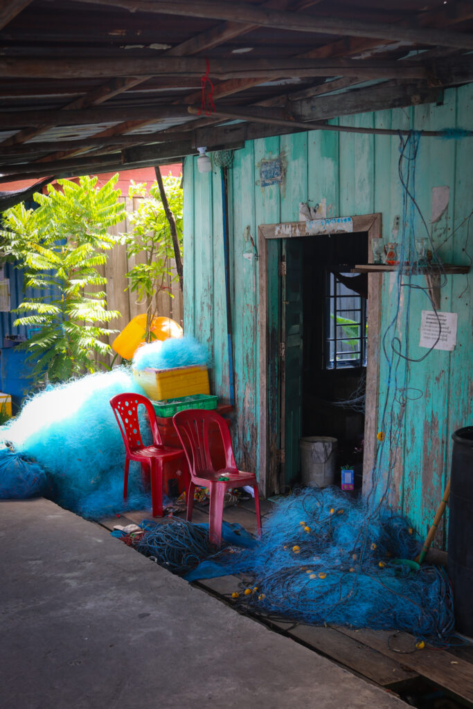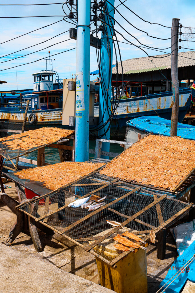 Koh Sdach, c’est un peu comme se perdre dans un autre temps, où le rythme de vie est dicté par la nature. Se promener dans les petites rues, entre les pontons sur pilotis, voir le travail de la pêche sous toute ses formes… Les kilomètres de filets de pêche suspendus dans tous les recoins, contribuant au charme authentique et naturel de l’endroit… c’est un peu comme se retrouver dans un jeu vidéo où chaque détail semble presque irréel.