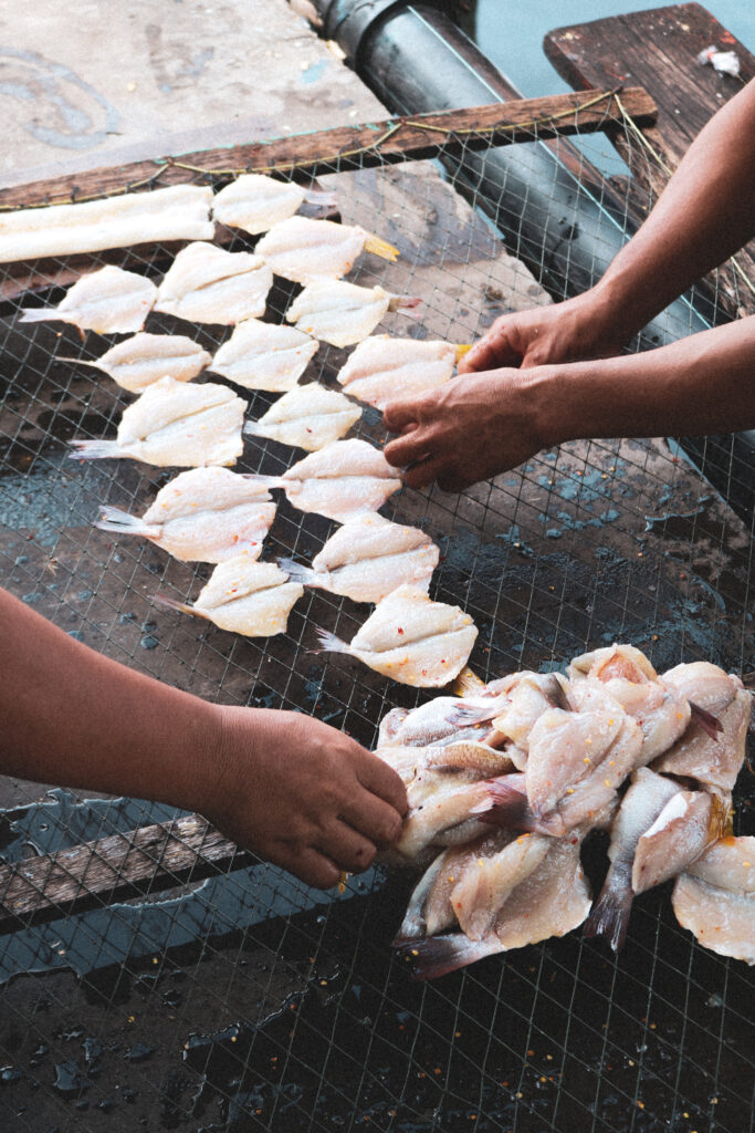 Le village flottant s’étend sur le bord de l’île, et une petite route de 2 km serpente à travers le paysage et la nature, tout en bordant les commerces locaux sur une partie. Des petits chemins vous conduiront au front de mer où vous y trouverez un village flottant, des rues étroites et des maisons traditionnelles. C’est ici que vous pourrez découvrir le processus de séchage du poisson, un savoir-faire ancestral. Les femmes du village préparent le poisson, le marinent, puis le suspendent sur des grilles faites maison pour qu’il sèche au soleil, une scène typique qui donne une vraie impression d’immersion dans la vie locale.