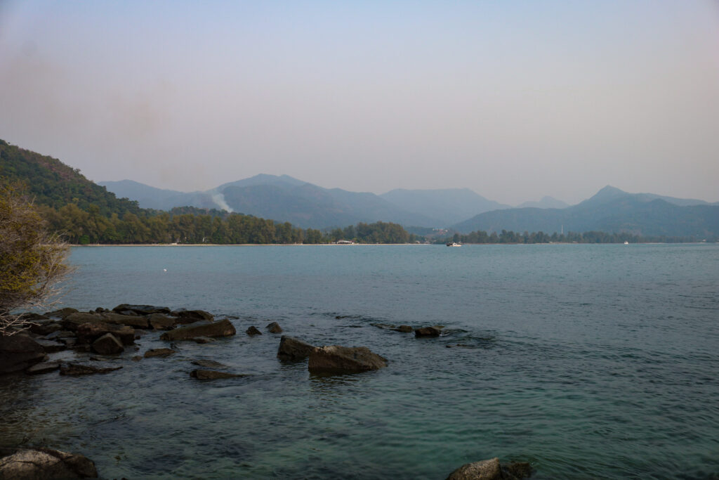Direction la pointe sauvage de l’île, avec une route qui longe la mer et offre des vues sur le continent et la ville de Trat. D’un côté, une forêt dense ; de l’autre, la mer, souvent à notre niveau. La route est tout aussi belle que du côté Ouest, mais très différente, et sans l’effet montagnes russes.